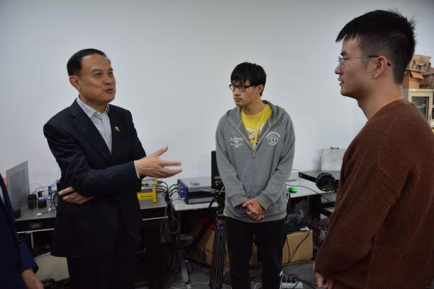 随后,张立新书记一行在郭兴明书记的陪同下,来到了英国正版365首页国家级力学实验教学示范中心-光测力学实验室参观。叶益民、魏延杰、王硕等3名博士生分别向张立新书记一行介绍了自主研发的便携式无损检测设备、红外热波无损检测系统及单目视频挠度仪,双方对三套系统的应用前景进行了讨论。