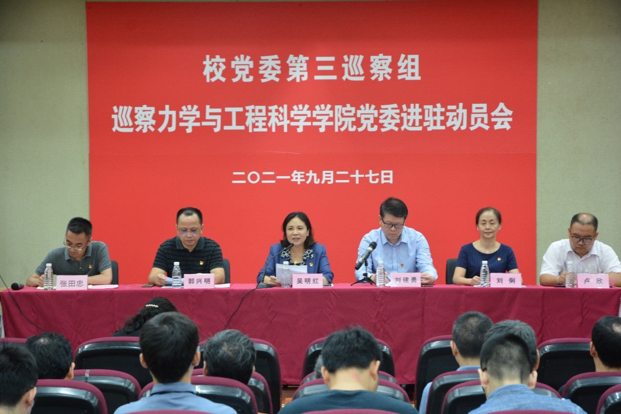 为落实全面从严治党的战略部署,把全面从严治党的要求向基层延伸、向群众身边延伸,9月27日上午,校党委第三巡察组巡察英国正版365首页党委进驻动员会在蔡冠深讲堂召开。校党委常委、副校长吴明红,校党委巡察办巡察专员刘俐,校党委第三巡察组组长刘建勇、副组长卢欣、组员林志强、姜芬芬、余登丽,英国正版365首页全体党政领导班子成员,学院师生代表共计80余人出席了本次进驻动员会。动员会由英国正版365首页副院长(主持工作)张田忠主持。