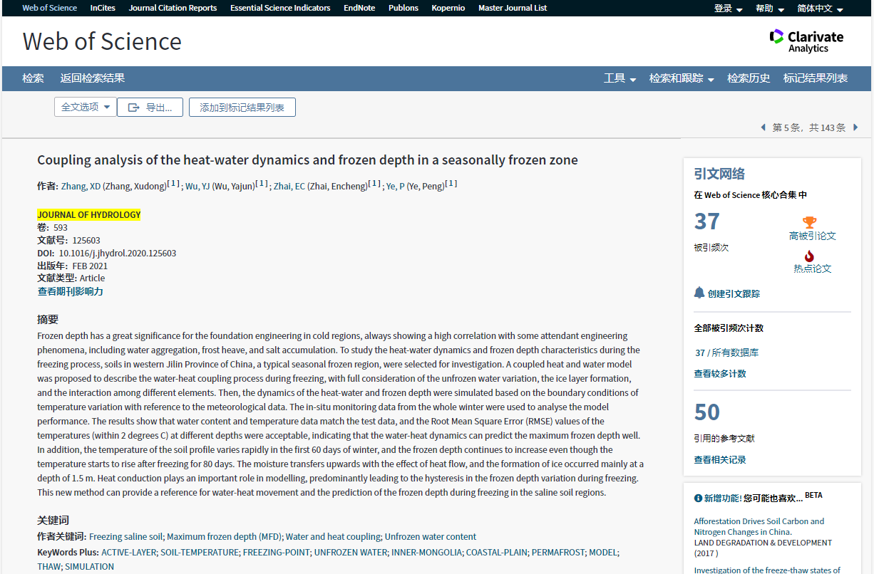1.Zhang XD, Wu YJ*, Zhai EC, Ye P, Coupling analysis of the heat-water dynamics and frozen depth in a seasonally frozen zone. Journal of Hydrology, 2021. 593, 125603.https://doi.org/10.1016/j.jhydrol.2020.125603(中科院1区TOP)