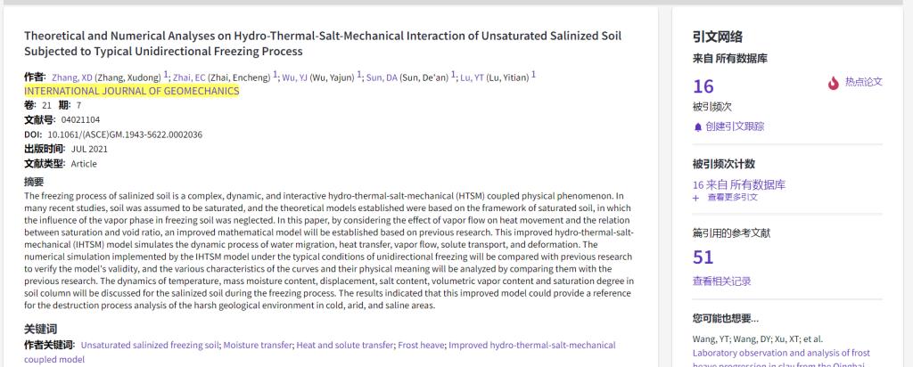 3.Zhang XD, Zhai E, Wu YJ*, Sun DA, Lu Y.,Theoretical and Numerical Analyses on Hydro-Thermal-Salt-Mechanical Interaction of Unsaturated Salinized Soil Subjected to Typical Unidirectional Freezing Process.International Journal of Geomechanics. 2021, 21(7): 04021104. (ASCE期刊)