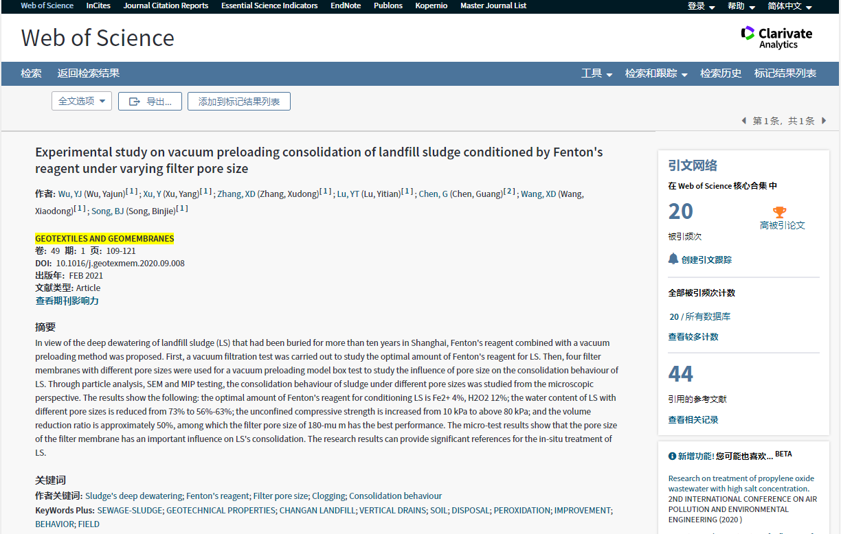 2.Wu YJ, Xu Y,Zhang XD*, et al. Experimental study on vacuum preloading consolidation of landfill sludge conditioned by Fenton's reagent under varying filter pore size. Geotextiles and Geomembranes, 2021. 49(1): 109-121.https://doi.org/10.1016/j.geotexmem.2020.09.008 (中科院1区TOP)