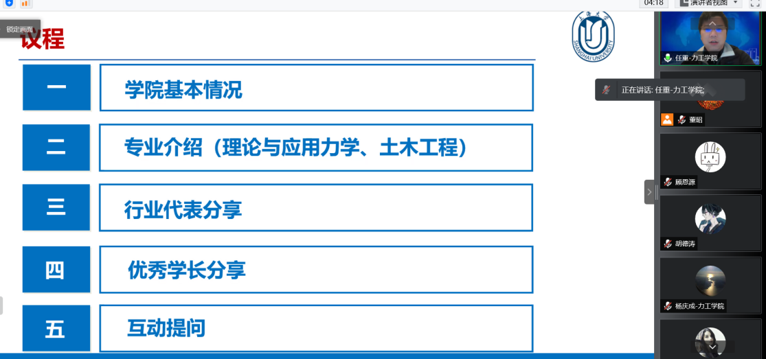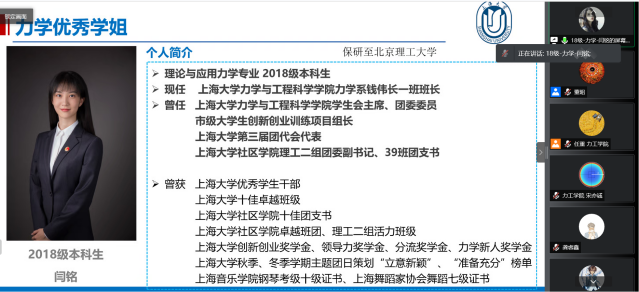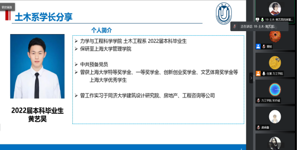 学院邀请了99级校友、中国商飞上海飞机设计研究院研究员樊建超,世界500强上海建工四建集团人力资源部副总经理殷君杰两位杰出校友代表,就行业人才需求和职业发展前景等进行分享。最后,两位优秀的直研学生:闫铭学姐和黄艺昊学长线上分享了本科阶段课程学习、成长感悟和升学深造经验。宣讲会后很多同学踊跃提问,热情地向专业老师和学姐学长们了解学院的详细情况。