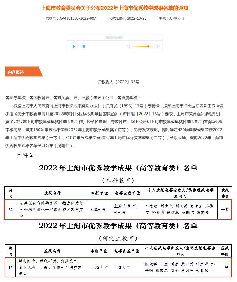 日前,上海市教委公布了2022年上海市优秀教学成果名单,我院叶志明教授领衔申报的“从慕课到实时共享课,推进优质教学资源均衡化-沪喀两校之教学实践”、陈立群教授领衔申报的“经典阅读、课程研讨、强基成才、固本见功—一般力学博士生培养新模式”双双荣获上海市优秀教学成果一等奖。