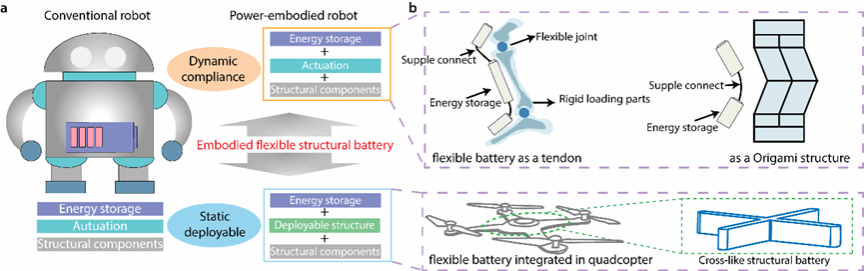 由于诸如环境监测、操纵和运输小型物体等工业应用的需求不断增加,轻质量、长续航的小型机器人的需求不断增长。因此,如何在质量及体积的限制下设计更高功能集成的结构组件具有重要的意义。这种多功能组件在生物系统中广泛存在,例如在人体中,脂肪不仅是一种用来储存能量的生物组织,而且还具有保护器官、维持温度和促进健康细胞功能等附加功能。在电池系统中,能够同时实现储能和承载功能的电池被叫做结构电池。然而,传统的结构电池难以实现大的变形和在动态环境下承载,这给柔性和可展开结构的机器人设计具身柔性能源带来了巨大的挑战。