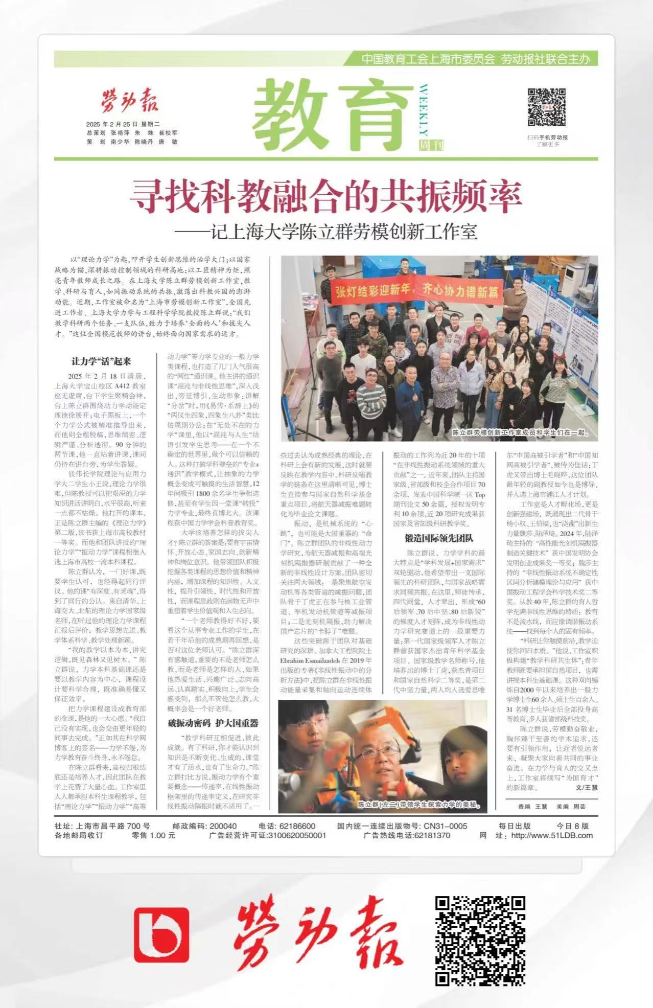 2月25日《劳动报》第8版“教育周刊”,整版刊发《365(VIP)英国上市陈立群劳模创新工作室:寻找科教融合的共振频率》。