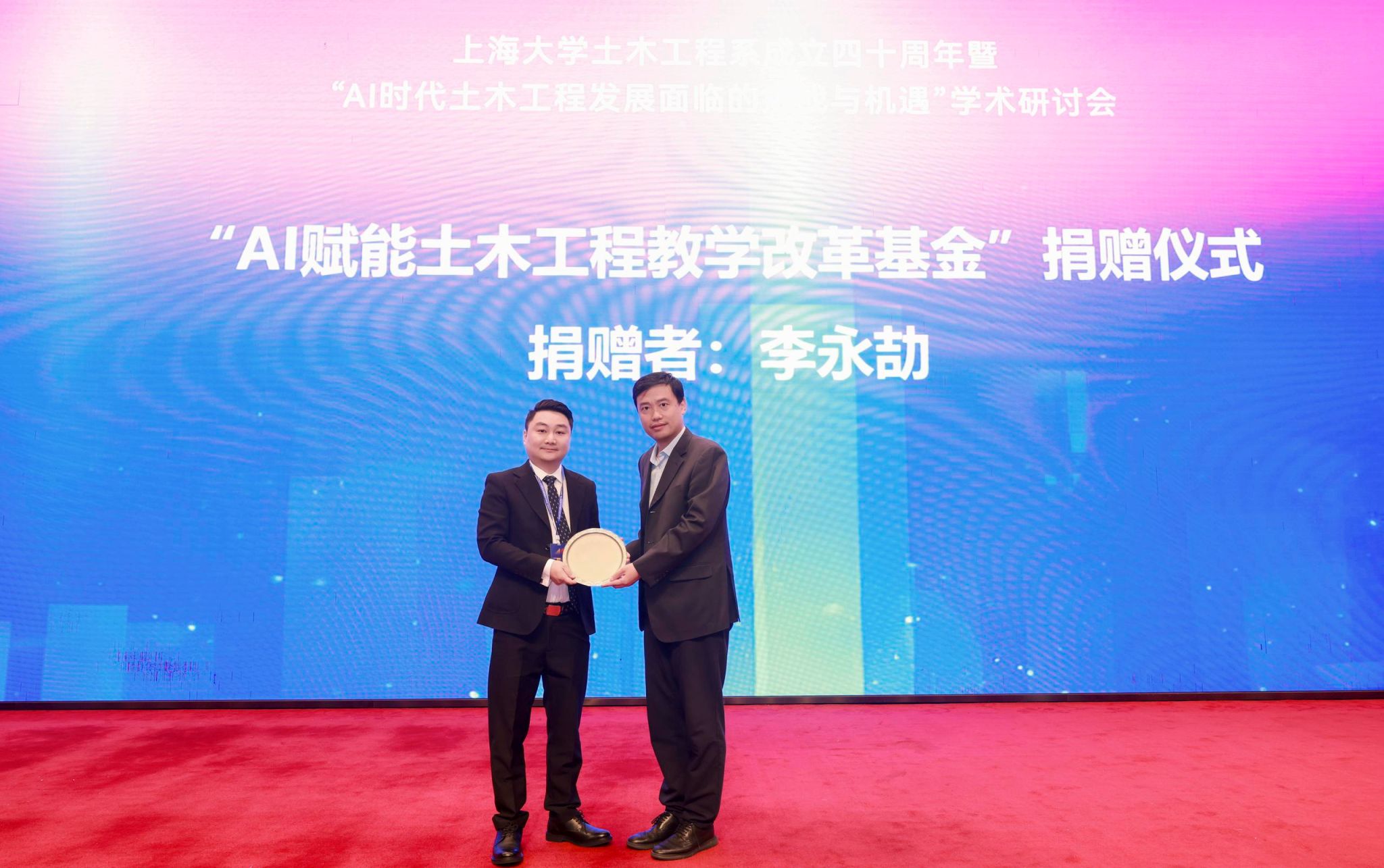 李永劼先生个人捐赠人民币两百万元,成立“AI赋能土木工程教学改革基金”。365(VIP)英国上市党委副书记、副校长胡大伟向李永劼先生颁发捐赠纪念牌。李永劼表示,人工智能与传统土木工程的深度融合,是未来工程领域发展的必然趋势。他希望该基金能助力土木工程系在AI+土木工程领域培养更多优秀的工程人才,为推动行业进步贡献力量。