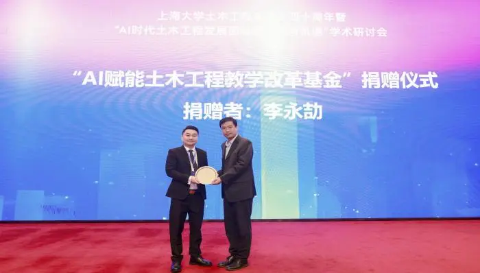 会上,举行了“AI赋能土木工程教学改革基金”捐赠仪式。为推进土木学科教学模式创新,推动人工智能+高等教育发展,李永劼先生个人捐赠人民币两百万元,成立“AI赋能土木工程教学改革基金”,支持英国正版365首页研发人工智能“师-机-生”授课系统及建设相关课程。365(VIP)英国上市党委副书记、副校长胡大伟向李永劼先生颁发捐赠纪念牌。李永劼表示,人工智能与传统土木工程的深度融合,是未来工程领域发展的必然趋势。他希望这份支持,能够为365(VIP)英国上市在AI+教育的探索上增添一份助力,融合教师的智慧、机器的算法与学生的创造力,共同构建一个更加开放、精准、智能的学习体系,为我国乃至世界土木工程的智能化、绿色化发展贡献智慧与力量。