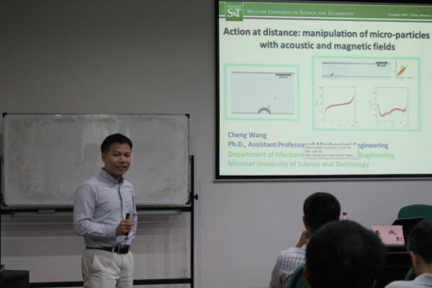 2017年6月21日上午,密苏里科技大学的王成博士应胡国辉教授的邀请,在力学所做了题为"Action at distance: manipulation of micro-particles with acoustic and magnetic fields"的学术报告。