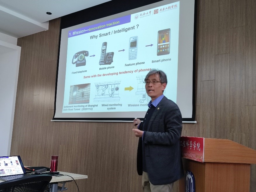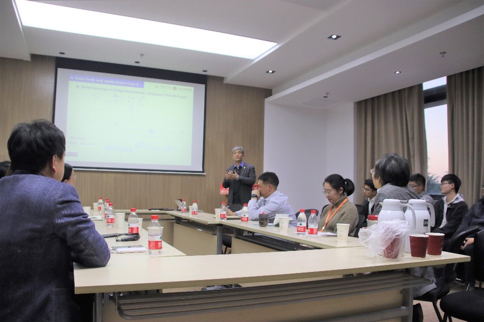 传统的有线技术在监测大规模基础设施时会遇到许多挑战。黄宏伟教授基于无线传感器网络(WSN)的实时智能传感技术的发展,阐述了通过采用不同类型的传感器节点监测基础设施的关键指标,并讨论了在土层和混凝土中的无线信号传输。报告会现场气氛活跃,师生发言积极踊跃,黄宏伟教授对老师及同学们关心的问题一一进行了详尽的分析和清晰的解答,并在报告会后就部分师生感兴趣的话题进行了深入的交流。大家对黄宏伟教授深入浅出的生动讲解及渊博的学识为之钦佩,领悟到将科学研究服务于工程实践的重要性。