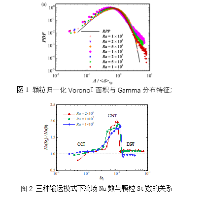 首先研究了带有惯性颗粒的湍流Rayleigh-Bénard(RB)热对流中两相之间的动力学耦合。研究发现,颗粒分布与流体涡结构有很强的相关性,在下扫事件和惯性偏差的影响下,中等Stokes数下两相之间产生强耦合,显著增强湍流动量输运和全局Nussult数(图1)。作者首次提出用颗粒引入动能占总动能的比例来量化动量耦合强弱,从能量角度出发推导出两相流系统的动能耗散精确表达式。另外,还研究了颗粒的沉降和局部聚集特性,理论解析得到了颗粒平均沉降率与Rayleigh数的标度律,数值预测结果与此理论标度关系高度吻合。这项研究成果以题为“Dynamic coupling between carrier and dispersed phases in Rayleigh-Bénard convection laden with inertial isothermal particles“发表在2022年流体力学顶级期刊《Journal of Fluid Mechanics》第930卷上。