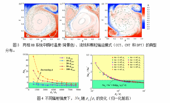 在上述研究基础上,聚焦于辐射加热颗粒RB对流系统的能量输运特性和传热效率的研究。推导了相间传热Nusselt数的理论表达式,得到了相间传热效率和相间热能传输与密度比的标度关系、颗粒放热与吸热的临界密度比与辐射强度和Rayleigh数的标度关系。研究发现相间传热效率和相间热能传输均随着辐射强度的增加而线性增强,且线性增长率与Rayleigh数和密度比分别呈现了特定的标度行为。同时观察到流场中存在颗粒放热和颗粒吸热两种不同状态,理论分析得到了区分吸/放热两种状态的临界密度比与辐射强度和Rayleigh数的标度关系(图4)。这部分研究成果以题为“On the energy transport and heat transfer efficiency in radiatively heated particle-laden Rayleigh-Bénard convection”发表在2022年流体力学顶级期刊《Journal of Fluid Mechanics》第953卷上。