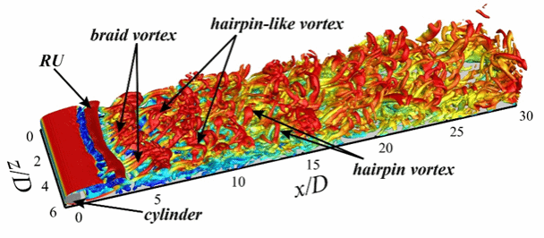 研究采用高精度的直接数值模拟获取近壁圆柱绕流的三维流场数据(图1),作者精细刻画了不同间隙比下圆柱尾涡与壁面边界层之间的相互作用和发卡涡的生成机制。首次发现由二次涡诱导生成的三次涡结构,利用定量计算边界层内扰动能量的增长等方法说明壁面边界层的转捩机制。利用模态分解证实二次涡和三次涡的特征频率与圆柱尾涡脱落频率一致,以及边界层转捩和条带结构生成相关等物理特性。相关成果发表在流体力学顶级期刊《Journal of Fluid Mechanics》上,论文DOI号:10.1017/jfm.2022.930。