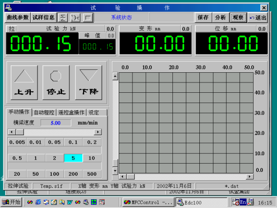 4.加载试验:(1)选择“手动操作”,设定试验速度,建议低碳钢试样设为5mm/min,铸铁试样设为1-2mm/min。(2)点击“上升”开始拉伸试验,注意观察试样、曲线显示区的曲线以及载荷与位移显示值的变化。(3)低碳钢试样将依次出现变形的四个阶段。当载荷从最大值开始下降时可以看到试样的颈缩区,如果试样表面光滑、材料杂质含量少,可以清楚地看到表面45°方向的滑移线。试样断裂后试验机自动停止加载。