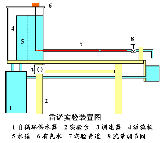 打开开关3使水箱充水至溢流水位,经稳定后,微微开启调节阀8,并注入颜色水于实验管内,使颜色水流成一直线。通过颜色水质点的运动观察管内水流的层流流态,然后逐步开大调节阀,通过颜色水直线的变化观察层流转变到紊流的水力特征,待管中出现完全紊流后,再逐步关小调节阀,观察由紊流转变为层流的水力特征。
