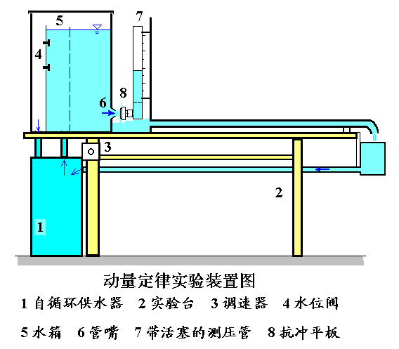 自循环供水装置1由离心式水泵和蓄水箱组合而成。水泵的开启、流量大小的调节均由调速器3控制。水流经供水管供给恒压水箱5,溢流水经回水管流回蓄水箱。流经管嘴6的水流形成射流,冲击带活塞和翼片的抗冲平板8,并以与入射角成90