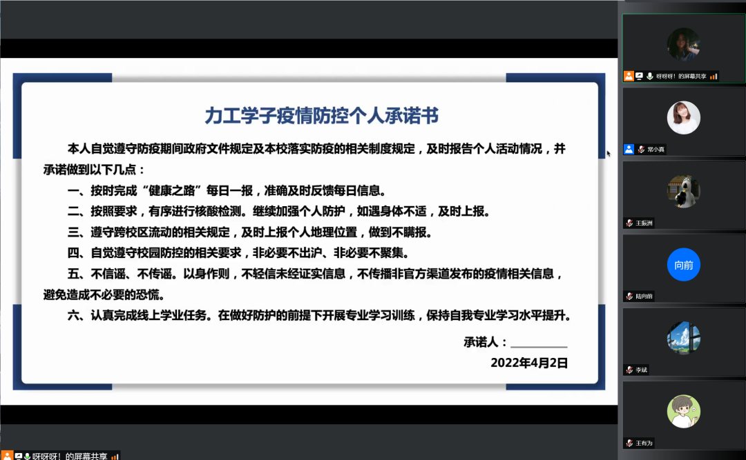 4月1日起,英国正版365首页各年级纷纷组织开展不同形式的校风校纪专项检查和教育活动。学院专兼职辅导员、学生干部走进学生寝室,核查人数,明晰情况,并制定力工学院疫情防控承诺书,确保疫情防控不断线。同时也通过线上宣讲,让同学们认识到疫情防控的重要性,齐心协力,共渡难关。